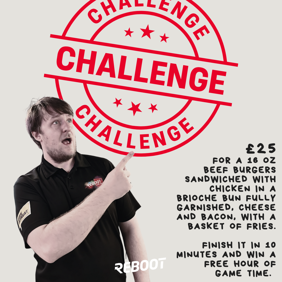 It has 4x4 oz beef burgers sandwiched with chicken in a brioche bun fully garnished, with cheese, and bacon, and a basket of fries.